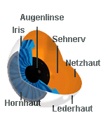 Die Iris mit der Pupille als Lichteinlass hat die Funktion einer Blende. Bei starkem Lichteinfall verengt sie sich, bei Dunkelheit erweitert sie sich. Nebenbei: Sie sorgt auch für die Farbe unserer Augen.